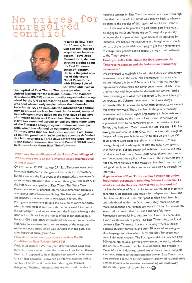 It was just days before the announcement of the year’s Noble Prize winners, that I, together with others, sat with Jose Ramos Horta on the floor of the SUARAM office discussing the second Asia Pacific Conference on East Timor (APCET2) . We took Jose to Acha’s, a section 5 PJ banana leaf almost restaurant, coincidentally adorned with placards of previous Nobel prize winners by the very chatty numerologist cum restauranteur. Most recently (2019) I attended the 20th Anniversary of the United Nation’s referendum on the territories independence because of my official role as co-convener of APCET2. We shook hands again.  I wonder how he kept faith in the cause of Timorese Independence despite the extraordinary obstacles, the stunning convergence of events that led to Timor Leste’s independence and the sometimes bloody mess that is Timor’s politics today. I filed several stories from Dili though I wasn’t on assignment; one with the foreign minister which I recorded on my iPhone, taking time out from an otherwise leisurely visit (my first and only) with some connections to make something more of my well-deserved junket. My political activism has lead my writing and journalism in productive directions, but it might also be said, that my journalistic work, and what I have observed as a result, has lead me out of political activism.